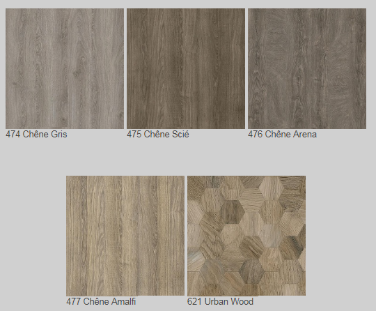 Lancement des nouveaux décors : 474 Chêne Gris, 475 Chêne Scié, 476 Chêne Arena, 477 Chêne Amalfi et 621 Urban Wood.