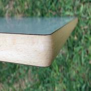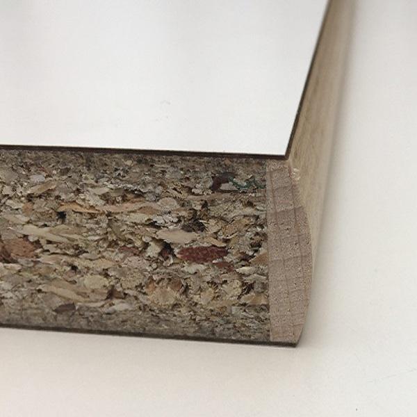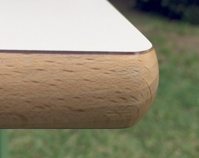 Fabriquée à partir d'un panneau de particules dont la bordure a été protégée par une alaise en bois Hêtre vernis. L'ensembles est recouvert des deux face par un stratifié décoratif HPL et usiné pour donner forme à la bordure.