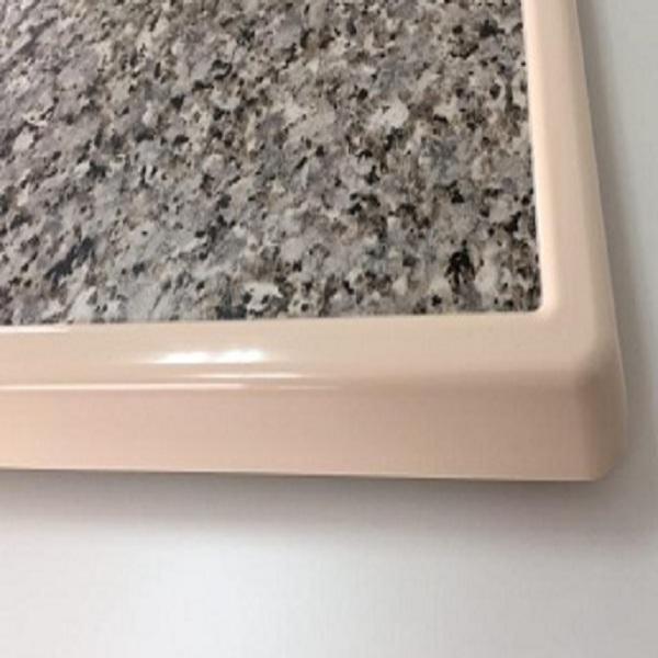 Ce stratifié est ensuite plié à chaud pour prendre la forme de l ‘usinage et s’y coller. Une touche très moderne et excellente alternative aux produits traditionnels (bois, marbre, granite).