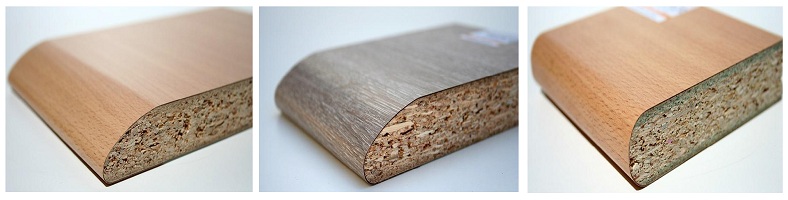 Les dessus de tables postformés sont des panneaux de particules ou MDF avec un ou deux chants usinés en ¼, ½ rond, aile d’avion ou autres profils et sur lequel est collé un HPL qualité post-formable.